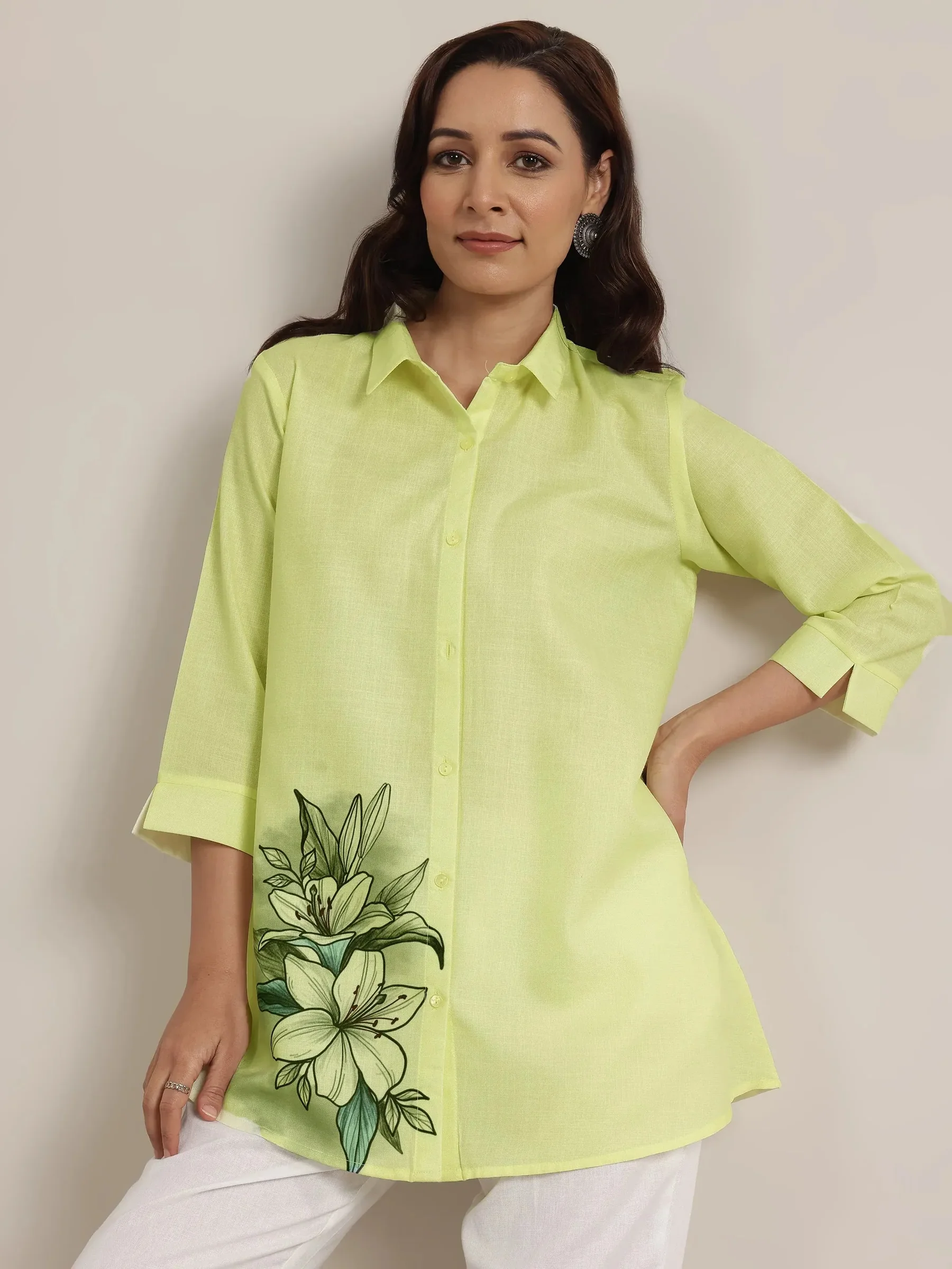 Lime Printed Cotton Blend Straight Short Kurti